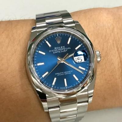 Brand: Rolex Range: Datejust Reference number: 126200 Gender: Ladies Movement: Automatic Case Dimensions: 36mm Crystal: Scratch Resistant Sapphire Bezel Color: Silver Water Resistance: Life waterproof Band Material: Stainless Steel Strap Colors: Silver Case Shape: Round Case Material: Stainless Steel Dial Color: Blue Bezel: Smooth Band Name: Oyster Bezel Material: Stainless steel Case Back: Solid Clasp: Folding Clasp With Safety Latch Availability: Item is in stock -