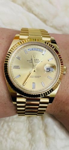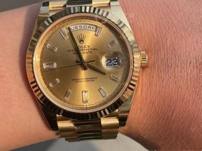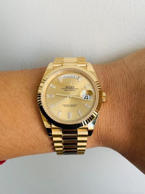 This Rolex Day Date replica is fantastic. The yellow gold strap is high quality and the golden dial is so detailed. The 40mm size is perfect for me.