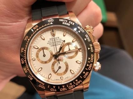 I'm very happy with my Rolex Daytona. It's a beautiful watch and I love the rose gold and ivory design.