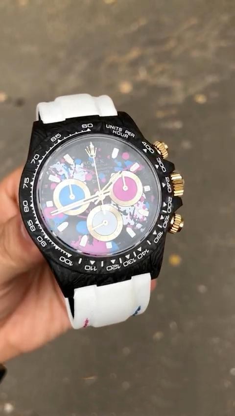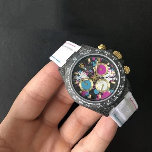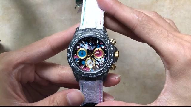 Swiss Rolex Daytona Replica Canvas strap 40MM.WWF new product release: The Diw team remodeled version of the ROLEX cosmic chronograph Daytona series. [Case] Made of carbon fiber material, light and comfortable to wear, each watch has a unique carbon fiber pattern. Because the carbon fiber material is very hard, the loss of the case during the CNC molding process is also very large! [Mirror surface] The double-sided electroplating high-permeability film process increases the permeability of the entire sapphire mirror surface by 50%; a good mirror surface can improve the texture of the entire watch! [Literal] Novel style, each nail scale is chamfered and polished to enhance the literal texture and gloss! [Bracelet] It is hand-woven from parachute fabric, with cowhide inside, breathable and comfortable, soft and very close to the hand, and the lines of the strap echo the literal color, which is completely in line with the original! [Movement] Using the precise and mature Shanghai 7750 chronograph movement, the functions are synchronized with the original!