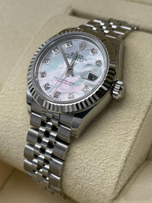 The oystersteel case has perfect weight, and the mother of pearl dial's natural patterns make each piece unique.