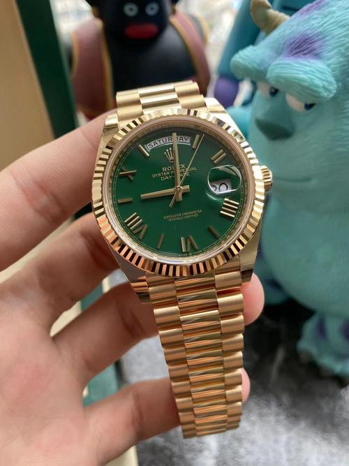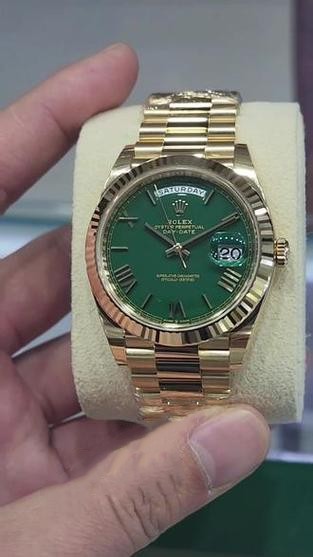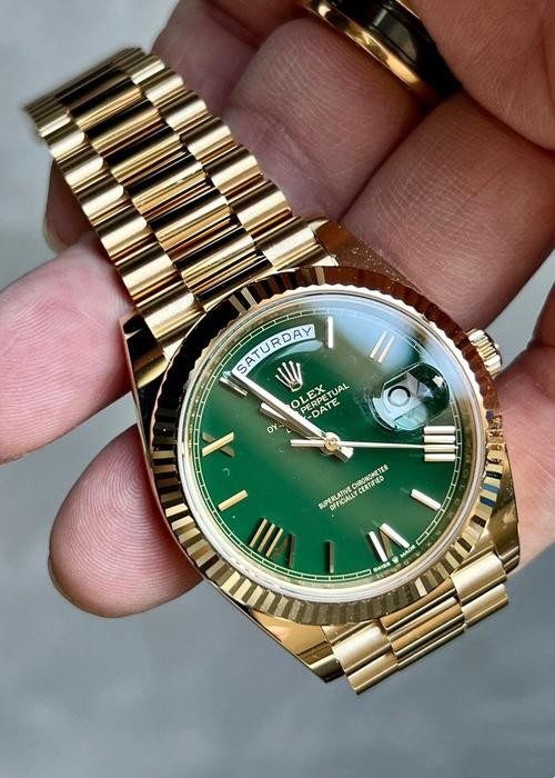 Brand: Rolex Range: Day Date Reference number: 228238 Gender: Mens Movement: Automatic Case Dimensions: 40 MM Dial Color: Green Strap Colors: Yellow gold Bezel Color: Yellow gold Crystal: Scratch Resistant Sapphire Case Material: Stainless Steel Bezel: Fluted Band Name: President Bezel Material: Stainless steel Water Resistance: Life waterproof Clasp: Folding Clasp With Safety Latch Availability: Item is in stock -