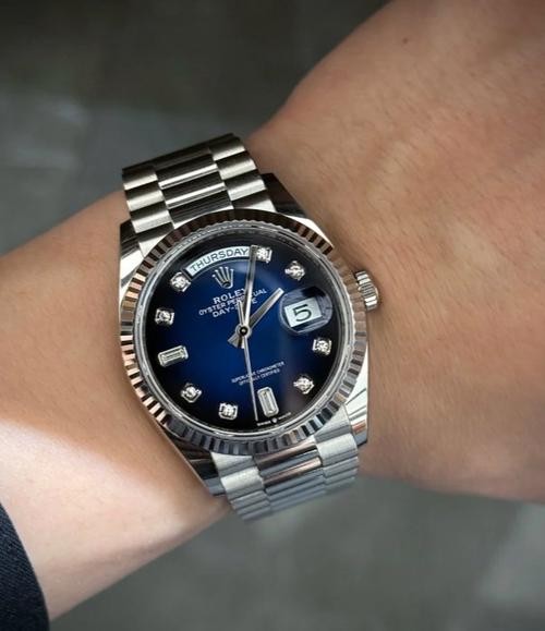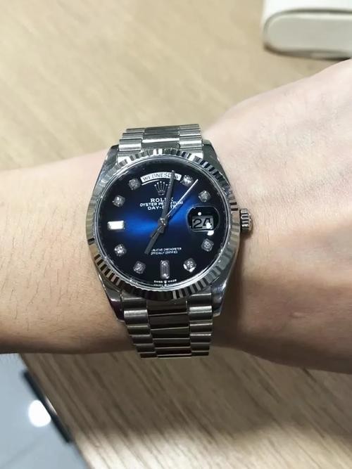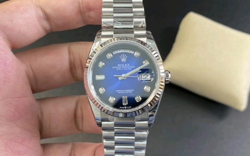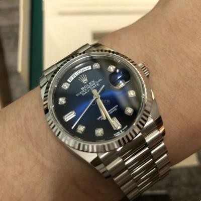 Swiss Rolex Day Date Replica 128239 Stainless steel strap 36MM.Replica Rolex Day-Date 36 Automatic Blue Diamond Dial Swiss Automatic Men's President Watch 128239----High quality stainless steel case with a 18k white gold rolex president bracelet. Fixed- fluted 18k white gold bezel. Blue dial with diamond hour markers. Dial Type: Analog. Date display at the 3 o'clock position. 3255 Automatic movemen. Scratch resistant sapphire crystal. Screw down crown. Solid case back. Round case shape. Case size: 36 mm. Water resistant at 100 meters / 330 feet. Functions: date, day, hour, minute, second. Additional Info: diamonds in 18 ct gold settings and baguette-cut diamonds at 6 and 9 o'clock. Luxury watch style.