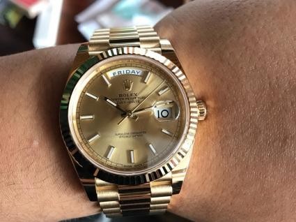 This watch is amazing! The yellow gold strap is so luxurious and the golden dial is beautiful. The 40mm size fits perfectly on my wrist.