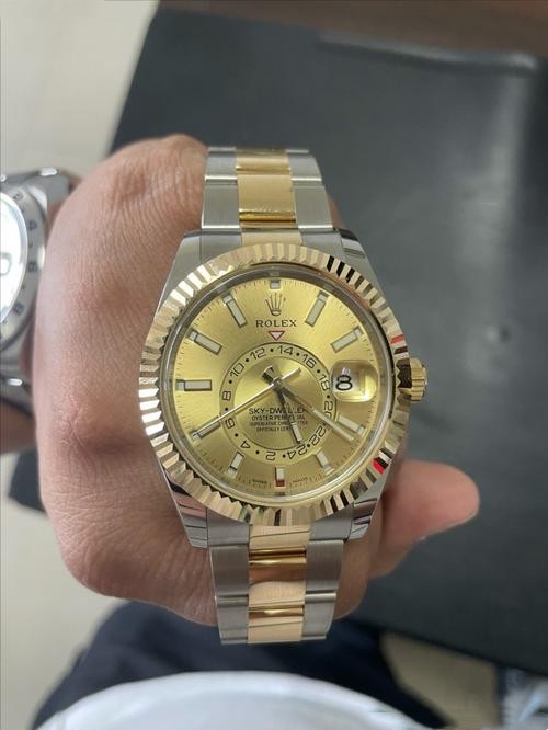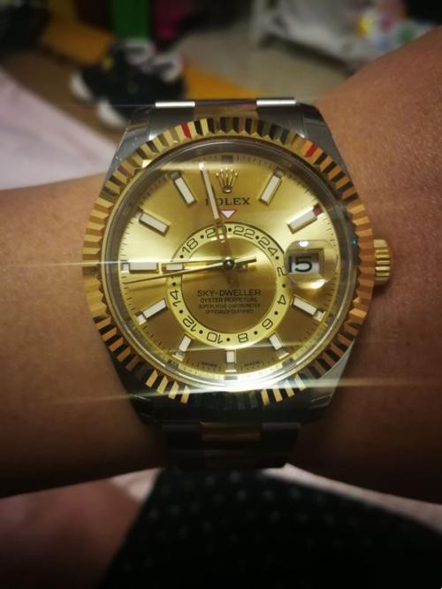 This Rolex Sky Dweller is perfect! The gold dial is beautiful and the stainless steel strap is so comfortable.