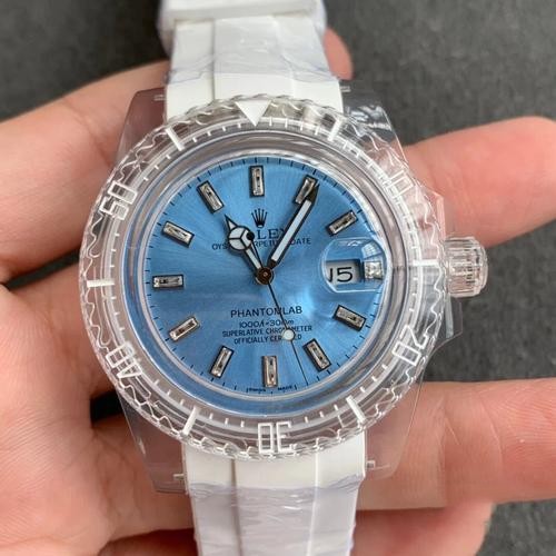 Swiss Rolex Submariner Replica Rubber strap 40MM PHANTOMLAB&ROLEX Baby blue Dial.TW factory Rolex PHANTOMLAB&ROLEX joint force crystal series watch attack! Subvert traditional concepts! PMMA crystal material! Top with 3135 blue gossamer movement! The best Thai imported rubber watchband market, never yellow (order is sent with the same material translucent watchband a pair) and the original fine grinding buckle, the whole table ice blue luminous, different from the market, more crystal transparent! After months of pursuing the beauty of details, unrestrained work, release the charm of the difference! TW originality inheritance, focus on excellent products!