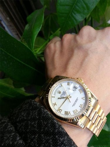 Brand: Rolex Range: Day-Date Reference number: 118238 Gender: Mens Movement: Automatic Case Dimensions: 36 MM Strap Colors: Yellow Gold Case Shape: Round Case Material: Stainless Steel Dial Color: White & Roman Numeral Crystal: Scratch Resistant Sapphire Bezel Color: Yellow Gold Water Resistance: Life waterproof Band Material: Stainless Steel Bezel: Fluted Band Name: President Bezel Material: Stainless steel Screw-in Crown: Yes Case Back: Solid Clasp: Folding Clasp With Safety Latch -